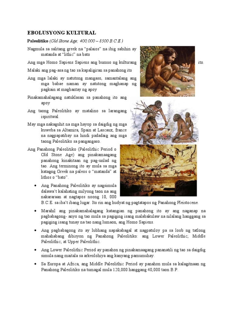 Jul 27 2013 Yumabong ang ibat ibang kultura tulad ng Aurignacian Solutrean at Magdalenian. View ebolusyonngsinaunangkultura-130727222403-phpapp01pdf from MATH CE 110 at Surigao State College of Technology - Surigao City. Kultura - ay tumutukoy sa sistemang paniniwala gawi pagpapahalaga o uri ng pamumuhay ng isang pangkat ng tao-Paleolitiko ay ang panahon kung saan makikitanakikita ang pagbabagong-anyo ng tao.