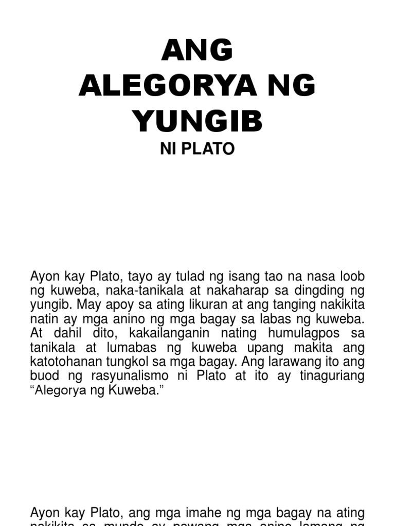 Ang Alegorya ng Yungib. Jun 24 2016 Ang Alegorya ng Yungib ni Plato Isinalin sa Filipino ni Willita A. Alegorya ng Yungib DRAFT.