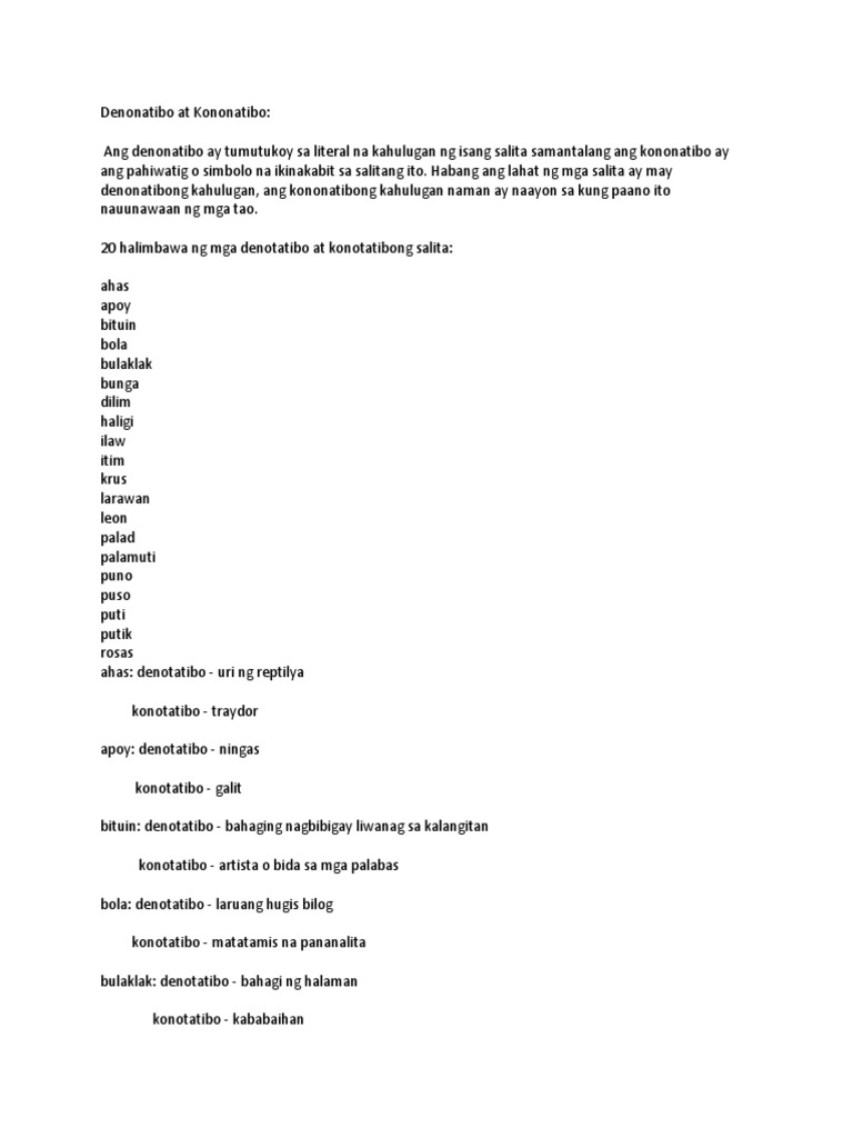Maibigay ang kahulugang denotasyon at konotasyon ng mga salita. Konotasyon- ay isang karaniwang naiintindihan na pagsasama-sama sa kultura o emosyonal na dinadala ng anumang naibigay na salita o parirala bilang karagdagan sa malinaw o literal na kahulugan nito na kung saan ay ang denotasyon nito. Apr 17 2021 Ang denotasyon ay ang literal na kahulugan ng mga salita.